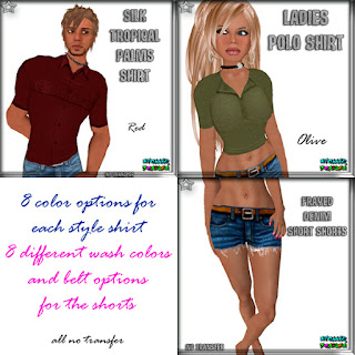 8 mens silk tropical Palm Shirts - 8 ladies shortie polo shirts and 8 sexy frayed denim short-shorts in different washes and belt styles. *breathes* that's it!